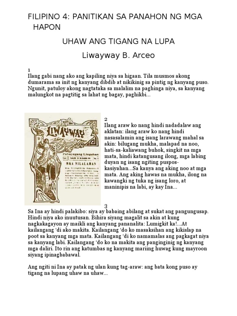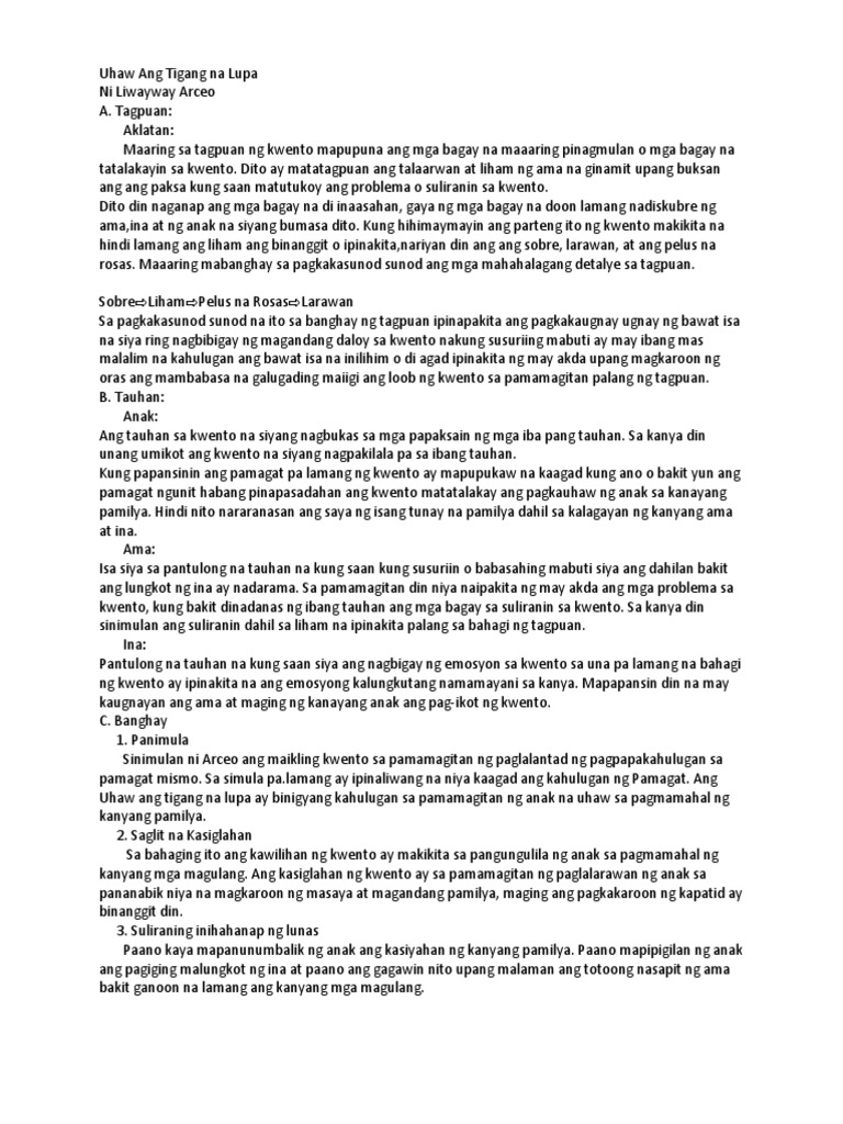 UHAW NA TIGANG NA LUPA Sa paksang ito ating babasahin ang buod ng kwentong Uhaw Na Tigang Na Lupa na isinulat ni Liwayway Arceo. Ika-14 ng Marso 2018 PAGSUSURI SA KWENTONG UHAW ANG TIGANG NA LUPA I PANIMULA Bago pa man tayo sinakop ng mga dayuhan ay may sarili na tayong literatura. Arceo UHAW ANG TIGANG NA LUPA Ni.