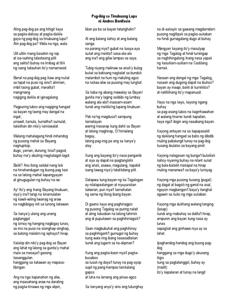 Love for ones homeland is a poem written by hero andres bonifacio. Kung ang pagka-baon niyat pagkabusabos sa lusak ng dayat tunay na pag-ayop supil ang pang-hampas tanikalang gapos at luha na lamang ang pinaa-agos 19. Pag-ibig sa Tinubuang Lupa Aling pag-ibig pa ang hihigit kaya sa pagkadalisay at pagkadakila gaya ng pag-ibig sa tinubuang lupa.